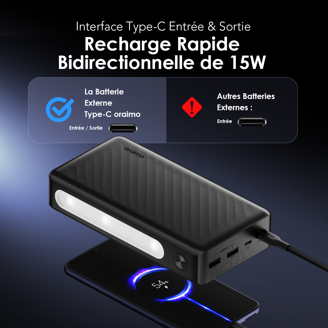 Une seule interface Type-C permet de recharger les appareils et de recharger la banque d'énergie elle-même.