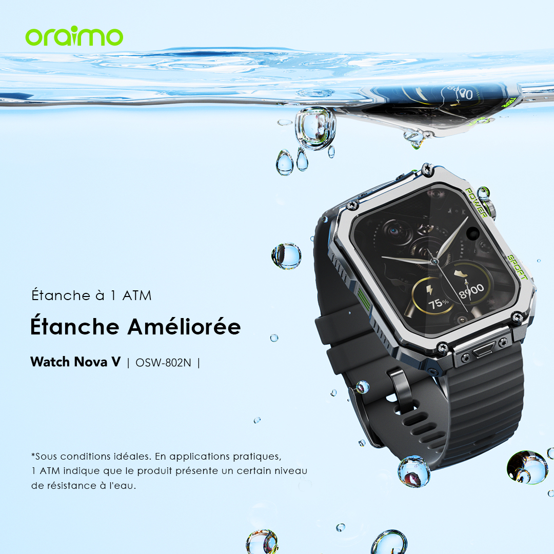 Avec une certification d'étanchéité 1 ATM, Watch Nova V peut résister à des pressions équivalentes à une profondeur de 10 mètres*.