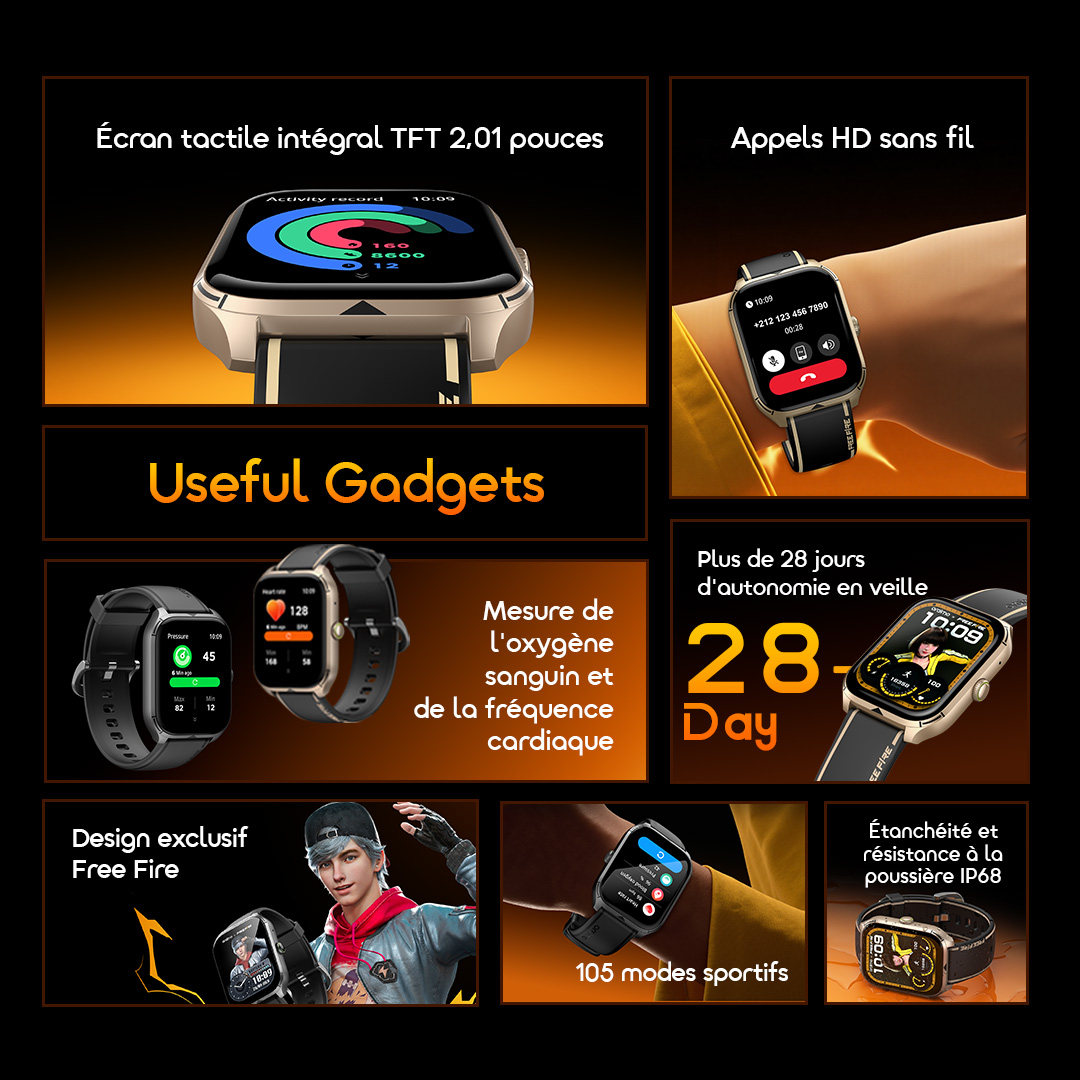 Personnalisez votre look avec les cadrans, bracelets, couronnes et boîtiers exclusifs Free Fire. Conçus pour les vrais gamers, ces accessoires en édition limitée apportent l'énergie de votre battle royale préféré directement à votre poignet : audacieux, dynamique et prêt à l'action.